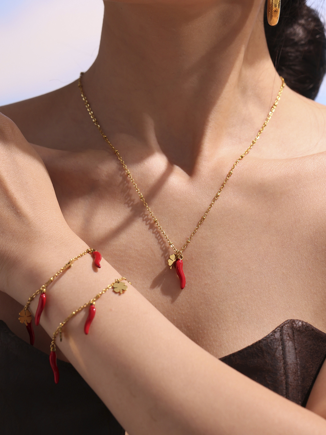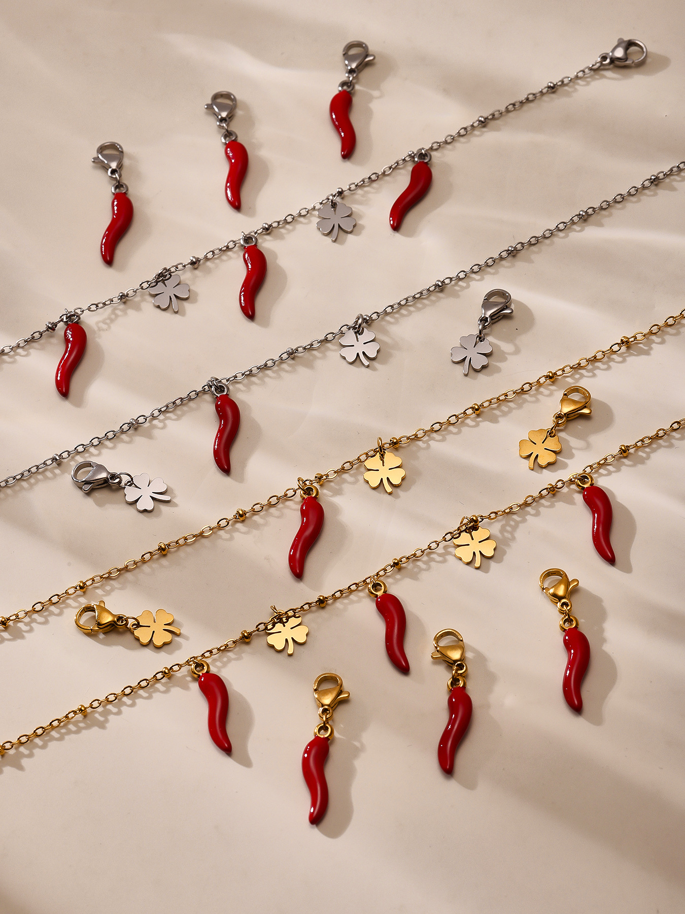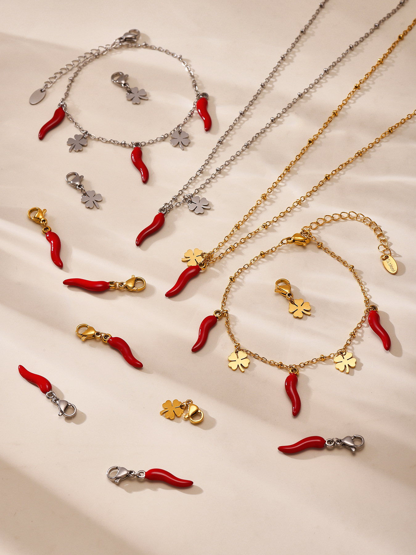 Color: TXP266-gold Red chilli necklace 405cm,TXP266-steel Red chilli necklace 405cm,TXE266-gold Red chilli bracelet 165cm,TXE266-steel Red chilli bracelet 165cm,d240-gold flower pendant 1,D240-steel flower pendant 1,d231-gold Red chilli pendant 1,D231-steel Red chilli pendant 1